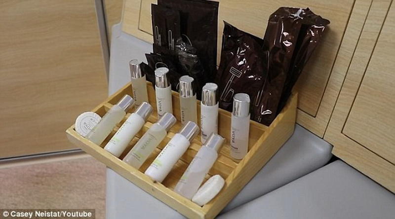 После еды Нейстат принялся за обследование туалетных принадлежностей, которые включают в себя не только небольшие упаковки шампуней и гелей для душа, но и настоящие пижаму и тапочки. А кресло пассажира может превратиться в удобную кровать, которую стюард застелет постельным бельем!