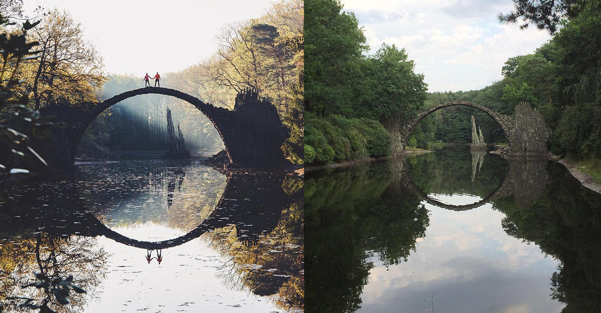 Здесь мост Ракотцбрюке (Чертов мост) в Германии выглядит появившимся прямо из сказки с туманным солнечным светом и парой, держащейся за руки.