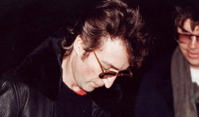 Джон Леннон даёт автограф своему убийце Марку Дэвиду Чепмену, Сам Чепмен - человек на фото, стоящий сзади.