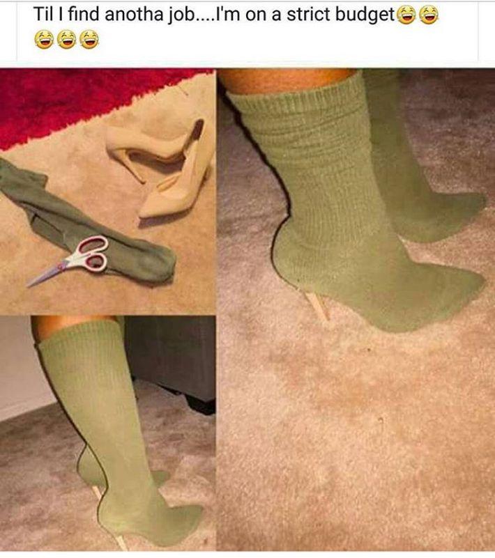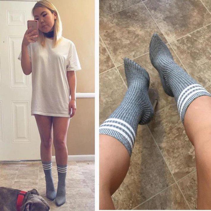 Новая сногсшибательная тенденция разлетается по миру со скоростью вирусной эпидемии! Обзавестись новой парой сапожек на соблазнительном каблуке без денежных затрат и беганий по обувным магазинам теперь может каждая модница, имеющая пару туфель на шпильке... Понадобятся только ножницы ...и носки!