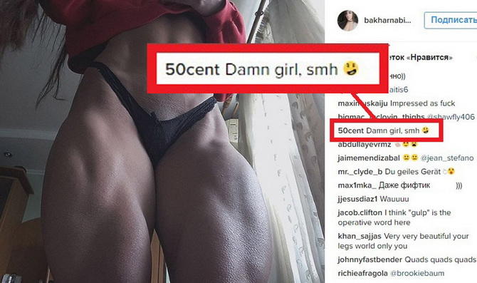Рэпер 50 Cent поражен рельефными ногами девушки и оставил следующий комментарий среди тысячи остальных: "Damn Girl, smh" ("Чёрт, девочка, качаю головой от восхищения).