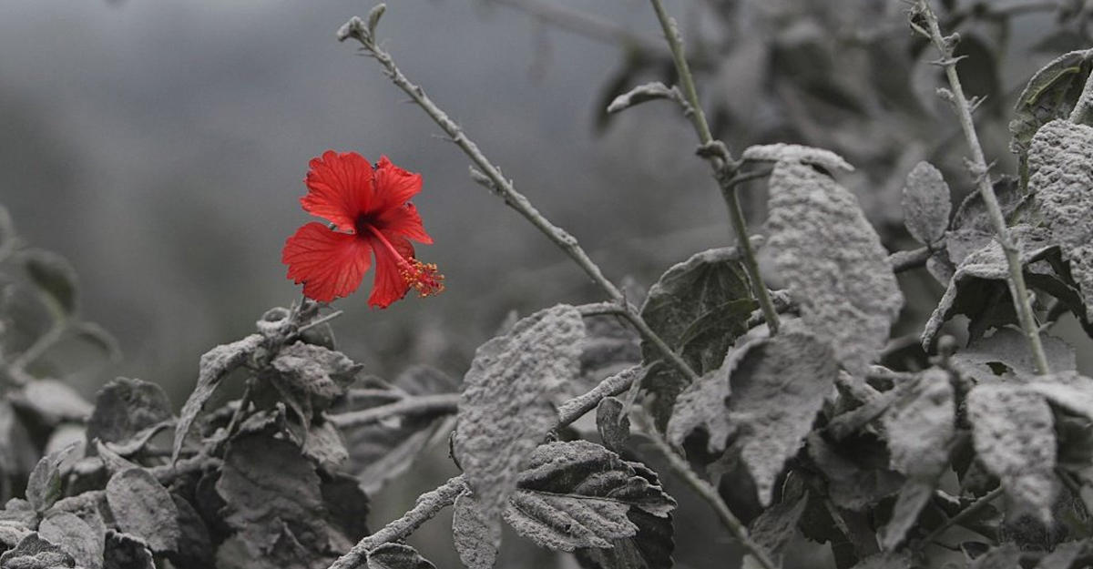Среди пепла. Цветок алого гибискуса сразу после извержения вулкана на острове Суматра.