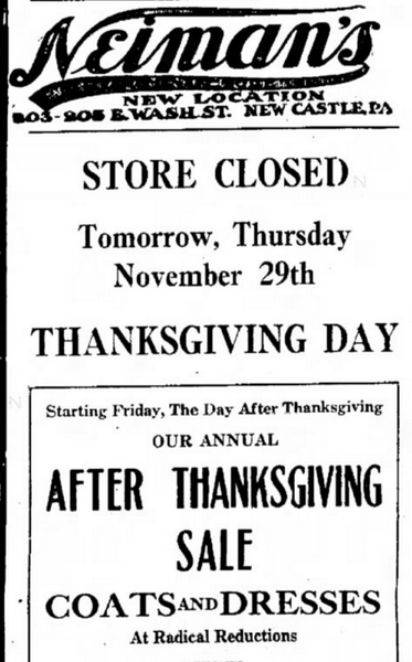 В 1923 году магазин в Пенсильвании рекламировал свою "Ежегодную распродажу после Дня благодарения" и "радикальные скидки на пальто и платья".