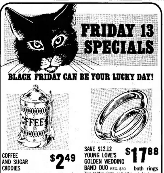 В марте 1970 года, когда до Дня благодарения оставалось около восьми месяцев, магазин в Пенсильвании устроил "Распродажу Черной пятницы", имея в виду пятницу, 13-е марта.