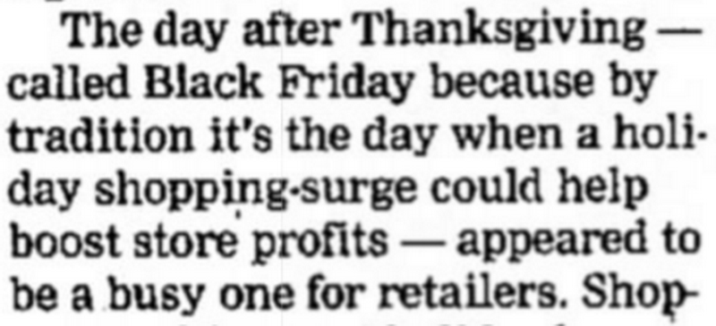 Это вырезка из газеты Standard-Speaker из Хэйзелтона, штат Пенсильвания, за 1989 год. Черная пятница все еще не ассоциировалась с чем-то хорошим и приятным.