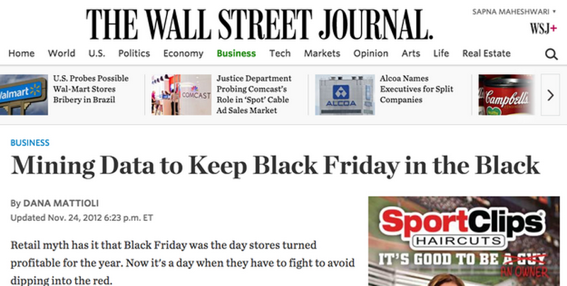 А вот заметка из Wall Street Journal за 2012 год. В ней говорится, что Черная пятница - вовсе не день, когда магазины получают прибыль, сравнимую с годовой, и что торговцы должны сражаться за то, чтобы не остаться в минусе из-за этой распродажи.