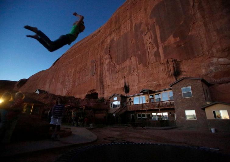 10. Девочки прыгают на батуте на фоне дома, функцию одной из главных стен которого выполняет скала, пустыня Мохаве, Юта, США