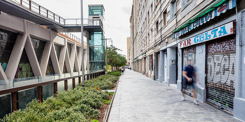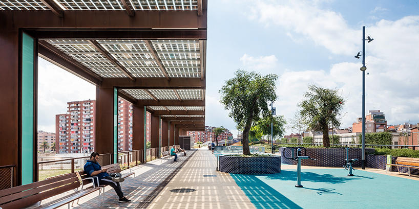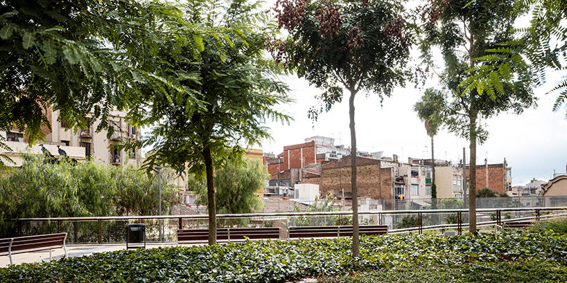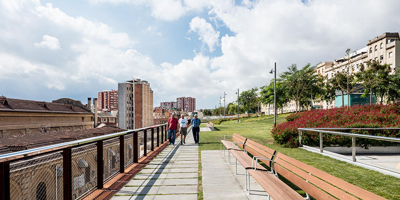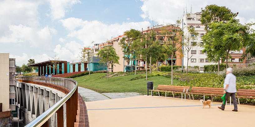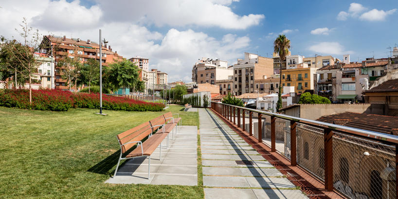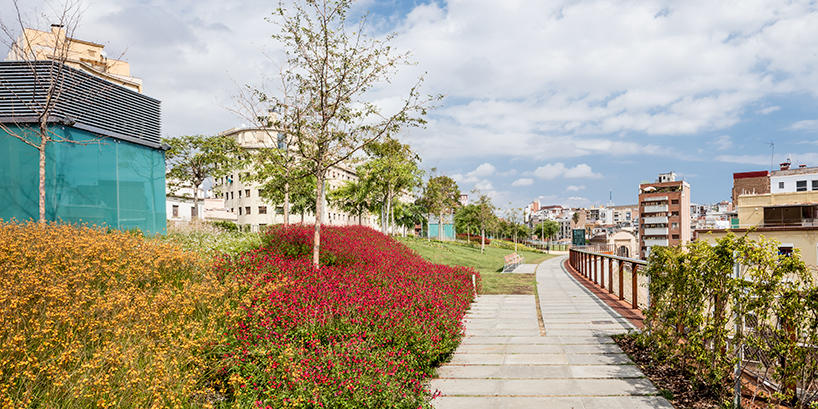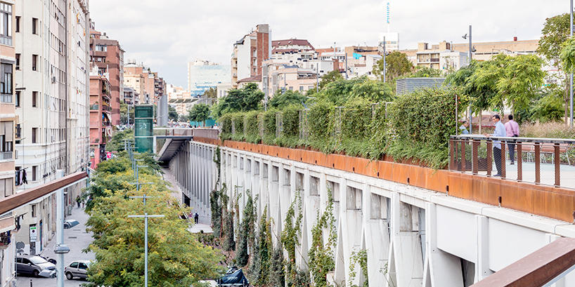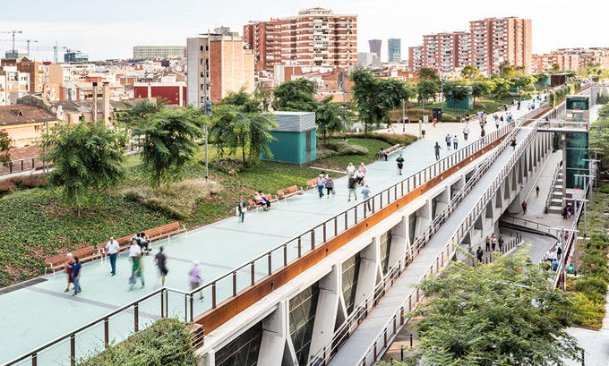 В начале этого года в Барселоне открылся удивительный парк Jardins de la rambla de sants. Часть железнодорожной линии, проходящей через город, была закрыта железо-бетонной конструкцией, наверху которой был разбит полноценный парк площадью 20.000 кв.м.