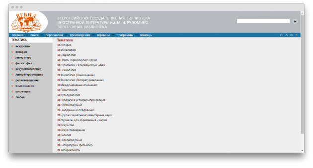 На сайте Всероссийской государственной библиотеки иностранной литературы собрана небольшая коллекция книг по гуманитарным дисциплинам. Здесь можно найти материалы по психологии, философии, педагогике и прочим обязательным дисциплинам.