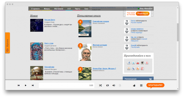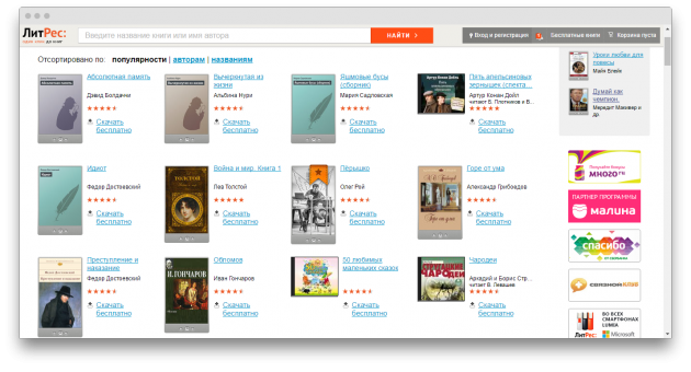 Популярный интернет-магазин электронных книг предлагает в свободном доступе свыше 3 500 произведений. В обмен на книги Михаила Булгакова, Захара Прилепина, Жюля Верна, Сергея Лукьяненко и многих других авторов просят зарегистрироваться. Между прочим, здесь можно найти и аудиокниги.