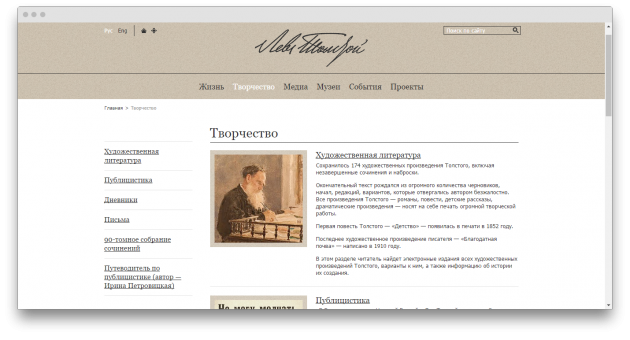 На сайте представлена эталонная версия всех сочинений Льва Толстого. Над оцифровкой трудились сотни и тысячи волонтёров: одни распознавали текст, другие исправляли ошибки. Книги доступны как для скачивания, так и чтения онлайн.
