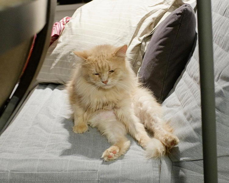 Как отмечает в Facebook хозяйка Пончика Полина Потапова, переезд из приюта, который должен был сделать кота счастливым, никак не повлиял на тоскливое настроение животного. "Мы привыкли к тому, как он иногда тяжело вздыхает в полной тишине. Но тоска не мешает ему быть гедонистом: он любит вкусную еду, чистую мягкую постель, оригинальные игрушки и, конечно, продолжительный сон", - рассказала она.