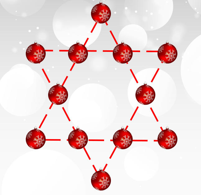 На рисунке изображены 12 новогодних шариков. Они расставлены таким образом, чтобы получилось 6 рядов по 4 шара. А теперь переставь их таким образом, чтобы получилось 7 рядов по 4 елочных украшения.