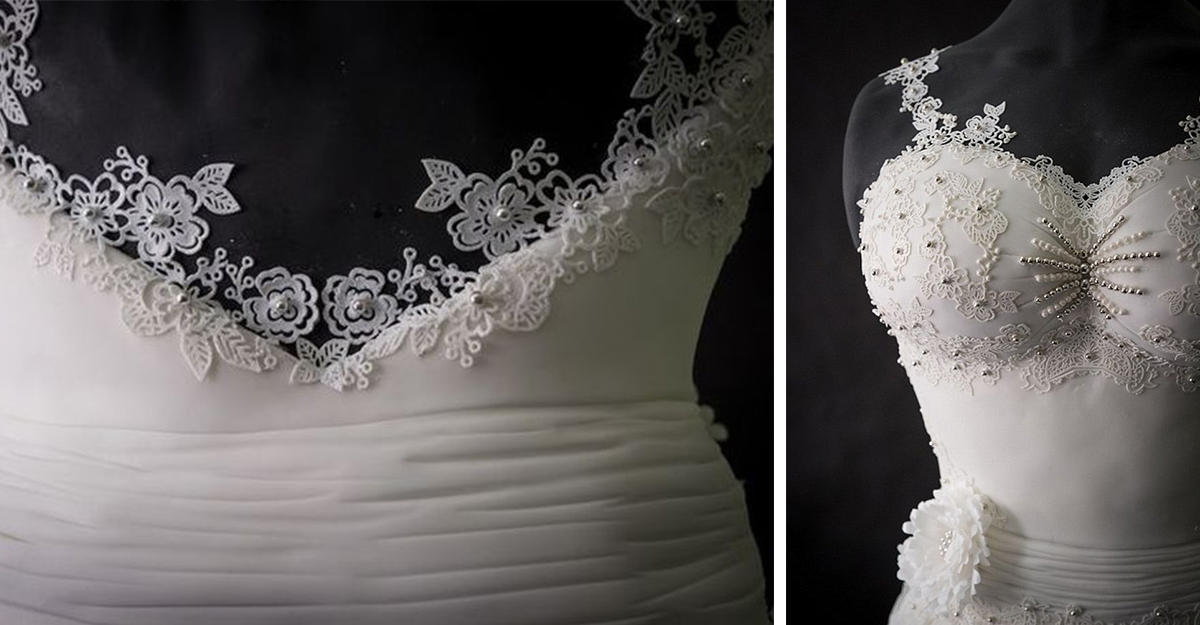 Только посмотри: тончайшие кружева, расшитый лиф, нежная и легкая ткань. Кто бы мог подумать, что это... торт! Он сделан настолько реалистично, что вполне можно попытаться натянуть его на себя. Увы, надеть не получится...