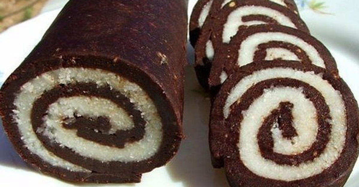 Пищевая пленка раскладывается на удобной ровной поверхности. На нее выкладываем коричневую массу из какао и печенья и покрываем ее кремом с ароматом кокоса. Аккуратно сворачиваем рулет и отправляем его на час (лучше дольше) в холодильник.
