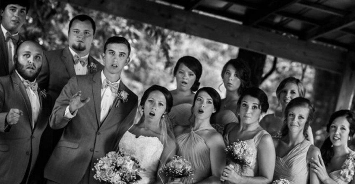Так случилось на одной из свадеб в штате Миссисипи. Фотограф, приготовившись снять групповое фото, поскользнулся и, падая, всё-таки успел нажать на кнопку своего фотоаппарата. В итоге получилась вот такая забавная фотография: жених, невеста и гости с открытыми ртами и изумлёнными лицами. Что сказать, самое ценное в этом кадре - настоящие, искренние, неподдельные живые эмоции. И даже фокус не потерян! Настоящие профессионалы даже падают профессионально.