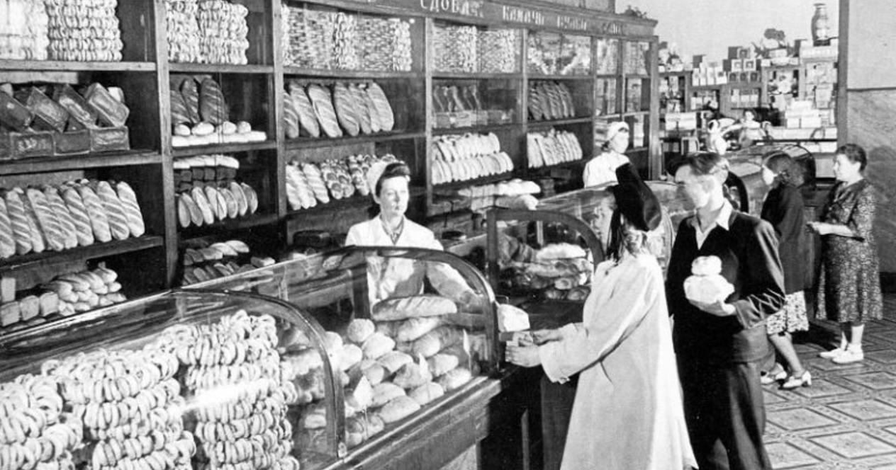 По сути, хлеб в СССР никогда не переставал быть дефицитным продуктом, хотя и составлял основу питания - без хлеба испокон веков в России за стол не садились. Ассортимент магазинов "Хлеб" и "Булочных", главным образом, был скудным, представленным "белым", "черным", "батоном" и "буханкой". Хлебобулочные изделия выставлялись на деревянных лотках, без какой-либо упаковки; в лучшем случае, к лоткам были привязаны (чтобы не украли) вилки - для пробы свежести товара. Рядом висела табличка "Хлеб руками не трогать".