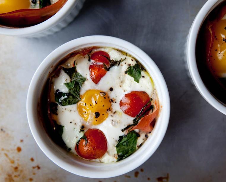 3. На дно формочки положите 1 ст. л. сметаны, сверху выложите нарезанные мелкими кубиками томаты. На них вбейте яйцо. Постарайтесь, чтобы желток остался целым и не растекся. Добавьте листья базилика. Залейте все еще одной ложкой сметаны, добавьте любимые специи.