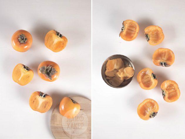 Вымыв и обсушив отобранную хурму, разделите её пополам и удалите примерно треть мякоти из каждой половинки с помощью чайной ложки.