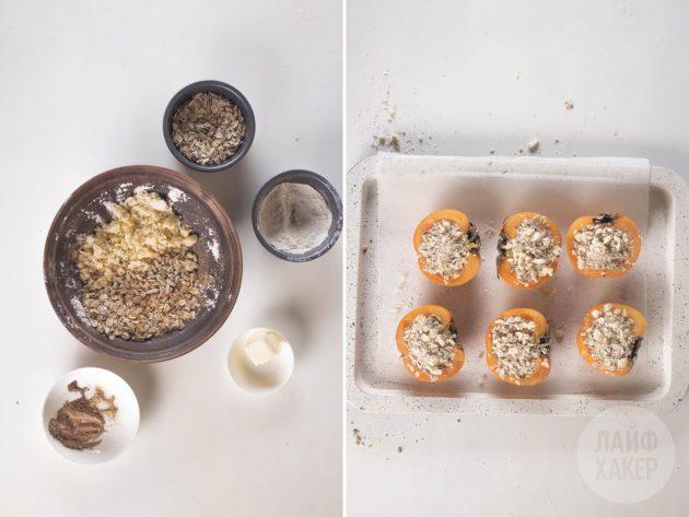 Теперь перейдём к смеси для наполнения хурмы. Для неё холодное масло необходимо порубить вместе с сахаром и мукой, добавить пряности и семечки с овсяными хлопьями. В смесь можно добавлять любые орехи, злаки и кусочки шоколада.