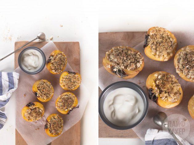 Выпекайте хурму при 200 градусах 12-15 минут, подавайте с йогуртом или просто так.