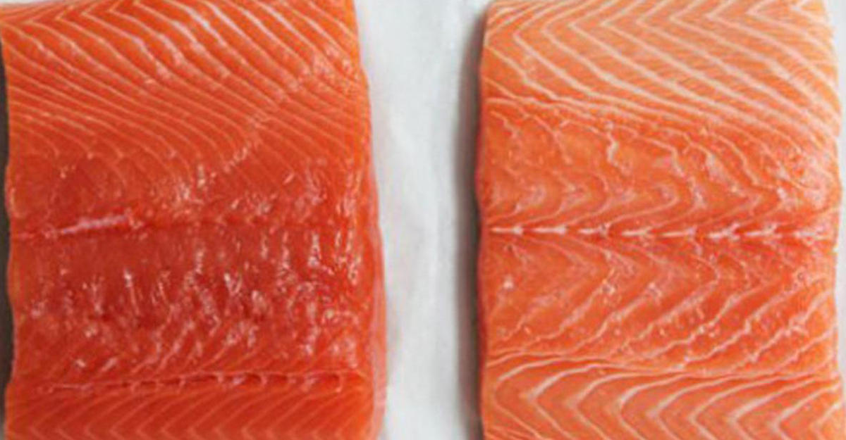 Лосось на левой картинке - пойманная на Аляске нерка. Лосось на правой картинке - разведен на ферме.