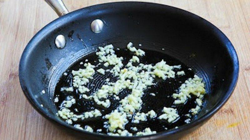 Чеснок измельчи и обжарь его на растительном масле до золотистого цвета.