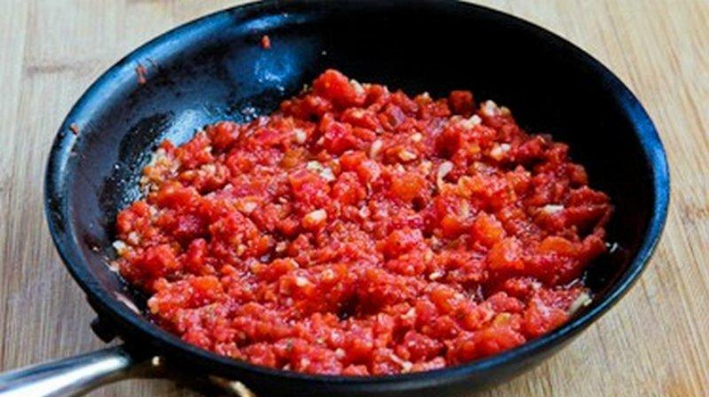 Добавь к чесноку измельченную зелень базилика, нарезанный мелкими кубиками помидор и туши до готовности.
